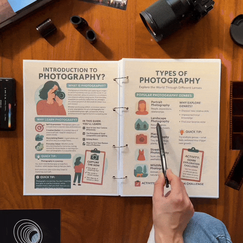 Photography Notes give you a clear, empowering path to improve — no more random YouTube dives or guesswork. Unlock creative confidence, technical skills, and a deeper connection with your unique style on every page.